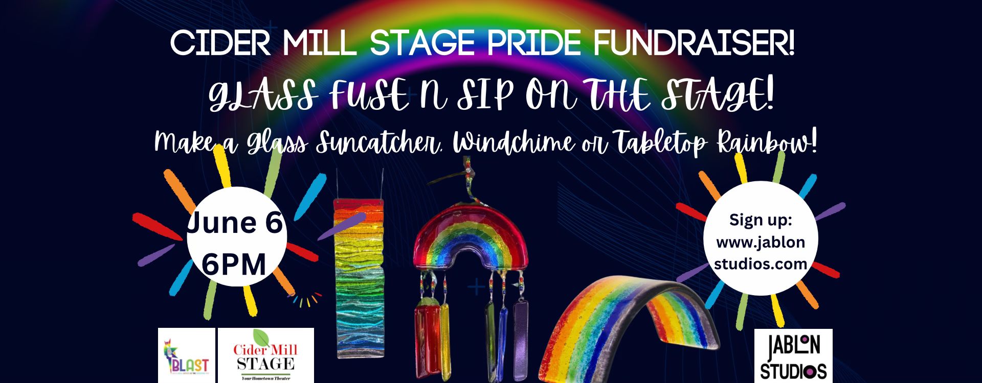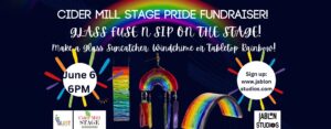 Celebrate Pride and support the arts at a unique, hands-on fused glass fundraiser for the Cider Mill Stage this June! Hosted right on the iconic stage itself, this creative event invites participants to design and make their own fused glass project while raising vital funds for our beloved local theater. You’ll have the choice to create a vibrant suncatcher, a rainbow-inspired wind chime (made extra durable with two stacked layers of glass), or a tabletop rainbow arch. While rainbow themes are welcome, you’re free to design your piece however you’d like—this event is all about expression, celebration, and community. Guests will learn how to cut and shape glass, adhere pieces using various techniques, and decorate their art using handmade glass stringers, marbles, powders, lace, and more. Once your masterpiece is complete, it will be kiln-fired at our studio and ready for pickup in about two weeks—or we can ship it to you if needed. There will be food and drinks available during the event, including wine, champagne, beer, and a selection of snacks to enjoy while you create. This event is open to all ages, kid-friendly, and perfect for beginners—no experience is necessary. All proceeds go directly to supporting the Cider Mill Stage and its mission to bring high-quality performing arts to our community. Tickets are non-refundable, but if you can’t attend, you’re welcome to transfer your credit to another class or complete your project at our studio at a later date.