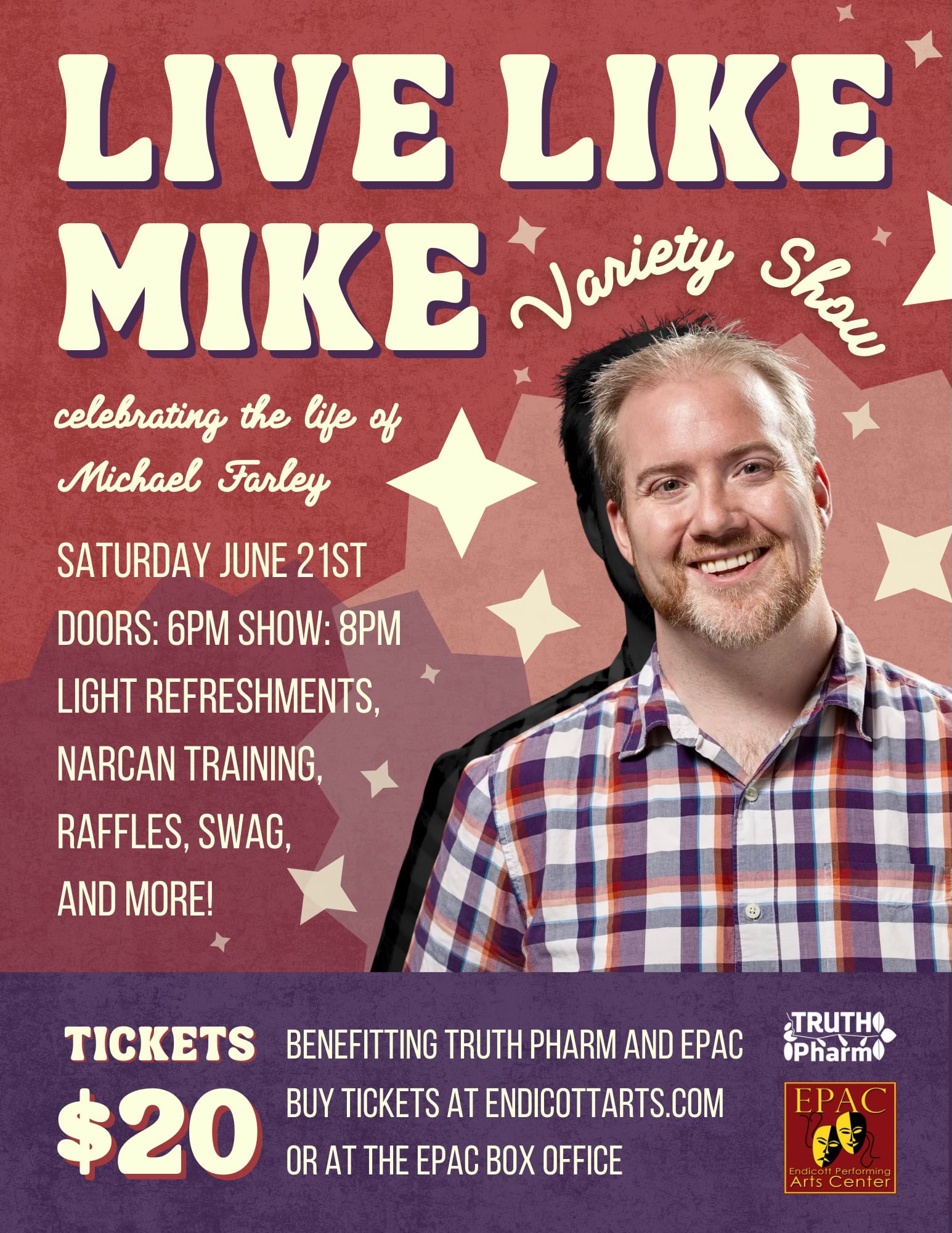 Live Like Mike Variety Show. Honoring the life of Mike Farley and bringing awareness. Doors will open at 6pm for light refreshments, mingling, raffles, narcan training, and swag! Show will start at 8pm.